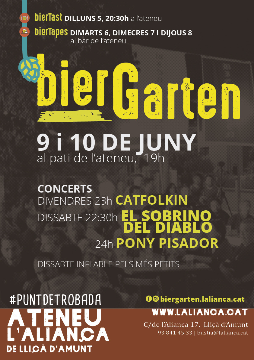 Cartell del bierGarten 2017 i de les activitats paral·leles bierTapes i bierTast, amb renovació de la imatge (nou tipus de lletra), un cartell menys carregat i amb més contrast.